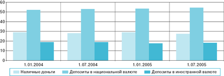 Произошли изменения и в структуре денежной массы (М2) с точки зрения степени ликвидности ее основных компонентов. Увеличение в I полугодии текущего года доли вкладов «до востребования» до 30,4% на 1.07.2005 (на 0,3 процентного пункта) сопровождалось ростом удельного веса срочных депозитов с 34,7% на 1.01.2005 до 36,1% на 1.07.2005. Доля наличных денег в обращении сократилась на 1,7 процентного пункта - до 33,5% на начало июля 2005 года.