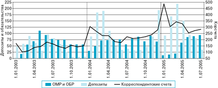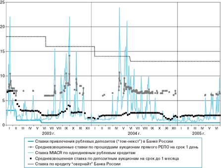 Снижение уровня ликвидности банковского сектора сопровождалось ростом средней величины и волатильности краткосрочных ставок рынка межбанковских кредитов (ставка MIACR по однодневным кредитам в рублях в последние дни апреля достигала 5,5% годовых, в последние дни мая - 5,7-6,7% годовых, в последнюю декаду июня - 6,7-9,7% годовых), а также существенным сокращением обязательств Банка России по депозитным операциям и ростом объемов операций Банка России по предоставлению денежных средств кредитным организациям. Объем операций прямого РЕПО, ломбардных кредитов и кредитов «овернайт» за период с 27.04.2005 по 30.06.2005 достиг 176,9 млрд. руб. против 5,3 млрд. руб. за предшествующий период текущего года.