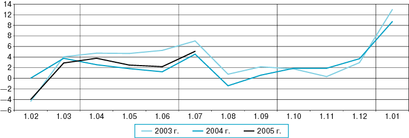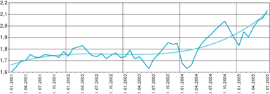 По данным Росстата, индекс промышленного производства за первые шесть месяцев текущего года составил 104% (за I полугодие 2004 г. - 107,3%). В январе-июне 2005 г. мировые цены на нефть сорта «Юралс» в среднем были равны 45,38 долл. США за баррель (в 2004 г. среднегодовая цена составила 34,62 долл. США за баррель). Цены на другие товары российского экспорта также возросли. В июне 2005 г. отмечались ослабление рубля по отношению к доллару США в номинальном выражении на 2,0% и его укрепление к евро на 7,6% (к декабрю 2004 г.). При этом, по оценкам Банка России, в июне 2005 г. индекс реального эффективного курса рубля к иностранным валютам (прирост к декабрю 2004 г.) составил 8,6%. По результатам первых шести месяцев 2005 г. инфляция составила к декабрю предыдущего года 8% (годом ранее - 6,1%). Рост рублевой денежной массы за I полугодие 2005 г. составил 12,9% (33,6% в годовом выражении за скользящие 12 месяцев) при оценке роста спроса на деньги на 2005 г. в диапазоне 20-32%. Денежный агрегат М210 за II квартал 2005 г. увеличился на 10,1%, в то время как в I квартале его прирост составил 2,6%.