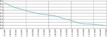 Снижение темпов прироста банковских вкладов физических лиц, главным образом срочных, в I полугодии 2005 г. по сравнению с аналогичным периодом 2004 г. было связано с уменьшением темпов роста реальных располагаемых денежных доходов населения. Так, если в I полугодии 2004 г. они составили 108,9%, то в январе-июне 2005 г. - 108,3% (к соответствующему периоду предыдущего года). Кроме того, снижение в структуре использования денежных доходов населения удельного веса средств во вкладах и ценных бумагах происходило на фоне роста доли, направляемой на покупку иностранной валюты (8% в I полугодии 2005 г. по сравнению с 7% в аналогичный период 2004 г.).