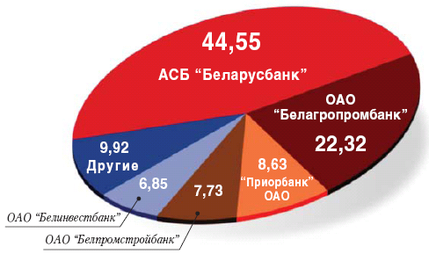 Лидирующие позиции на рынке кредитных услуг населению занимает ОАО “АСБ Беларусбанк” — более 70% от общего объема кредитной задолженности по республике. Это обусловлено исторически сложившейся специализацией банка на работе с населением, а также предоставлением физическим лицам льготных кредитов на строительство и приобретение жилья. Другим лидирующим банком на данном сегменте банковского рынка является “Приорбанк” ОАО, доля которого в общем объеме кредитной задолженности составляет 8,5%; еще у одного банка — ОАО “Белагропромбанк” — удельный вес составил 3,7%. (для сравнения за 2005 г. см рисунок 7)