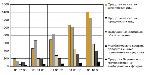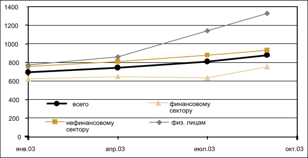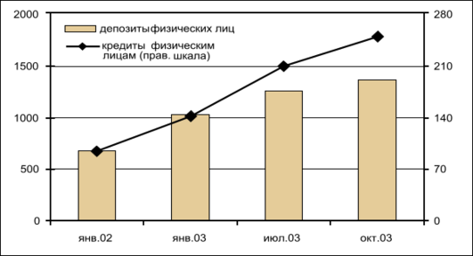 Динамика кредитных операций свидетельствует об опережающих темпах кредитования населения. Абсолютные объемы остатков по ссудам населению только за 8 месяцев 2003 г. увеличились со 142,2 до 244,3 млрд. руб., или в 1,7 раза (задолженность по кредитам корпоративного сектора тоже выросла, но лишь на 23%). Безусловно, необходимо принимать во внимание «эффект базы», однако неоспоримо и то, что примерно со второго квартала 2003 г. в кредитном процессе наметились качественно новые явления (cм. график 4).