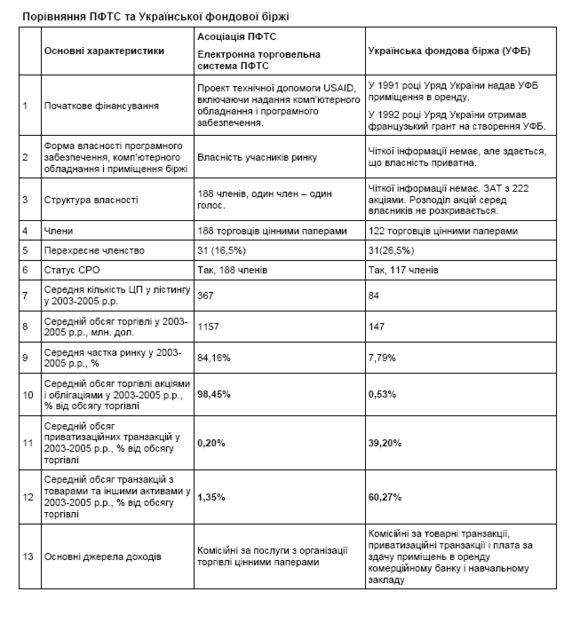 Порівняння характеристик діяльності фондової біржі УФБ та “електронної” торгівельної системи ПФТС в Україні [25]