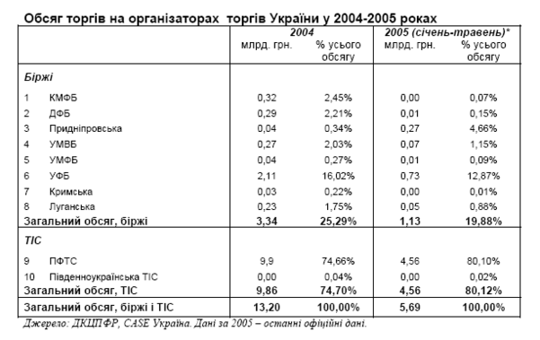 Аналіз підсумків діяльності Української фондової біржі за 2005 рік [25] показав, що незважаючи на збереження у 2005 році другої рейтингової позиції на біржовому ринку України обсяг торгівлі на УФБ у 2005 році зменшився в 1,9 рази у порівнянні з попереднім роком і склав 780,6 млн. грн. (відповідний показник 2004 року - 1,5 млрд. грн.).