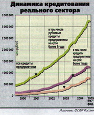 Отслеживая уровень кредитования в России можно сделать вывод об активности роста экономики. На графике 1.2.1. 2 видно, что в период с 2000 г. по 2005 г. Происходит стабильный рост уровня кредитования, следовательно растет деловая активность членов рынка, доверие к кредитным институтам.