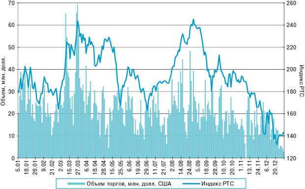 Рисунок 1. Динамика торгов акциями предприятий в РТС в 2003 году