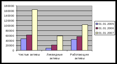 Сумма работающих активов стабильно растет. Так, на 01.01.2005г. их объем равен 44062 тыс. руб., на 01.01.2006г. темп роста составил 125,3%, а 01.01.2007г. – 188,4%.
