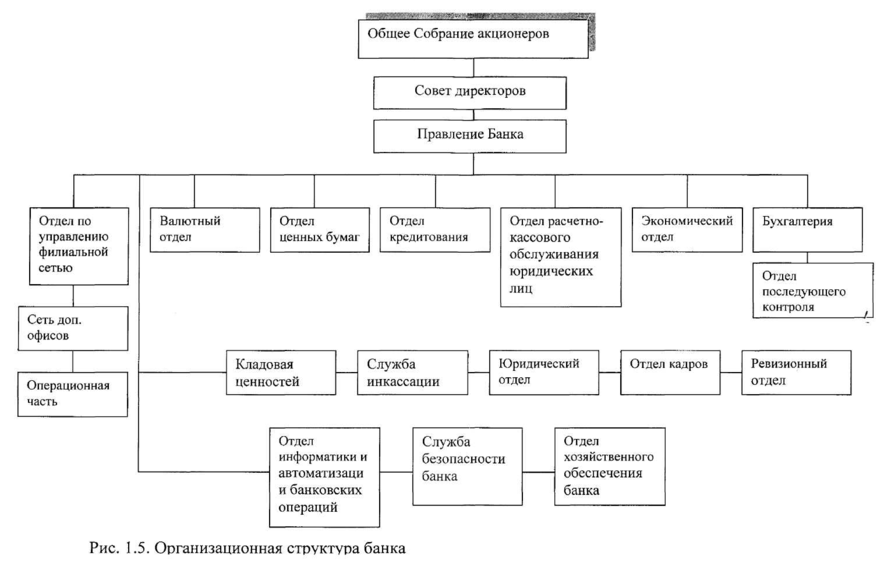 Банки в рыночных условиях специализируются на оказании различных видов услуг, ставят перед собой различные цели, а, следовательно, их организационные структуры могут варьироваться в широких пределах. Организационная структура банка призвана обеспечить рациональную организацию работы банковских служащих, успешное осуществление всех функций управления, максимальное удовлетворение потребностей клиентов и, в конечном счете, достижение целей, стоящих перед банковским менеджментом.