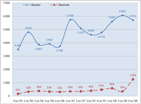 Объем премии, собранной в третьем квартале 2008 г. в сегменте добровольного страхования ответственности, вырос на 24%, с 4,6 млрд. руб. до 5,7 млрд. руб. Объем выплат возрос более, чем в 3 раза, с 0,4 млрд. руб. до 1,62 млрд. руб.