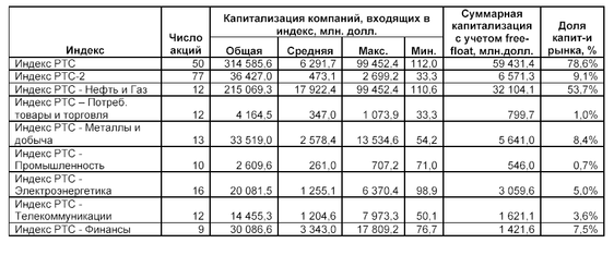 Наибольший вес в Индексе «второго эшелона» занимают следующие сектора экономики: электроэнергетика (25,6%), потребительские товары и торговля (12,6%), телекоммуникации (12,5%). Наибольший вклад в снижение Индекса РТС-2 в ноябре внесли ценные бумаги промышленности (-44,64 пункта в сумме), потребительского сектора (-37,31 пункта) и телекоммуникаций (-27,53 пункта).
