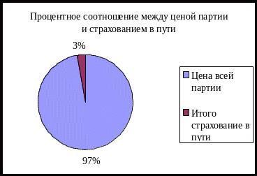 По данным таблицы 2.2 построена круговая диаграмма, отображающая процентное соотношение между ценой партии и страхованием в пути.