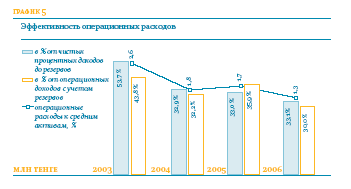 При этом процентная доля операционных расходов от средних активов сократилась с 1,7 % до 1,3 % соответственно за анализируемые периоды. Основной частью операционных расходов Банка являются расходы на персонал Банка, которые в 2006 году составили 50,7 % от общих операционных расходов по сравнению с 48,8 % в 2005 году. Увеличение обусловлено ростом численности (+40 % к прошлому году, в основном за счет расширения филиальной сети) и повышением размеров должностных окладов сотрудников в соответствии с рыночной конъюнктурой. В 2006 году амортизационные отчисления увеличились на 17,2 % и составили 1,833 млн тенге при 1,564 млн тенге в 2005 году. Данное увеличение связано с инвестициями Банка в сеть обслуживания клиентов. Так, объем средних основных и нематериальных активов в 2005 году увеличился на 49,3 % по сравнению с объемами за 2004 год.