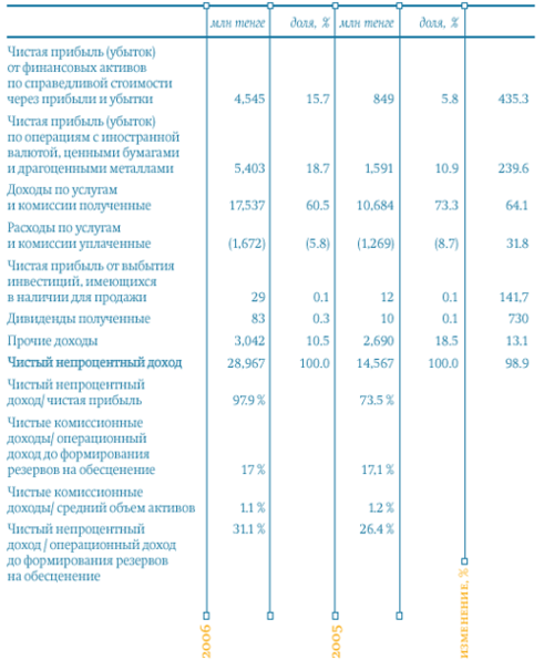 Таким образом, по данным таблицы 6 видно, что чистые непроцентные доходы за 2006 год составили 28,967 млн тенге и возросли на 98,9 %,с 14,567 млн.тенге за 2005 год. Основной составляющей чистых непроцентных доходов продолжают оставаться чистые комиссионные доходы. Их доля в 2006 году составила 54,8 % в сравнении с 64,6 %в 2005 году. Увеличилась доля доходов от финансовых активов по справедливой стоимости через прибыли и убытки, с 5,8 % за 2005 год до 15,7 %за 2006 год. Доля доходов от операций с иностранной валютой, ценными бумагами и драгоценными металлами также увеличилась — с 10,9 % за 2005 год до 18,7 % в 2006 году.