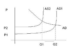 Как видно по графику, неблагоприятный шок предложения ведёт к росту цен. Смещение кривой совокупного предложения влево в результате это увеличивает издержки на единицу продукции, при возрастание цен сокращается реальный объём производства, или реальный ВНП.