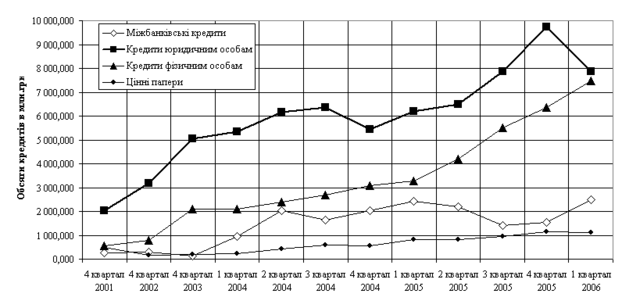а графіках рис.2.1 наведена динаміка росту обсягів інвестиційно-кредитного портфелю АКБ “Приватбанк” у 2001 – 2006 роках. Як показують графіки – кредитування юридичних осіб є найбільш вагомою часткою активних операцій банка. Але з 3 кварталу 2004 року (системна криза депозитної бази банків за рахунок політичних ризиків виборів Президента України) – АКБ “Приватбанк” почав пріоритетно нарощувати частку кредитування фізичних осіб, що особливо виражено у 1 кварталі 2006 року, коли обсяги кредитів юри-дичним особам зменшились на 2 млрд.грн., а водночас обсяги кредитів фізич-ним особам зросли на 1,2 млрд.грн. і обсяги міжбанківських кредитів зросли на 0,9 млрд.грн. Таким чином, АКБ “Приватбанк” виконує диверсифікацію кредитів по зменшенню обсягів, наданим одному позичальнику, що суттєво зменшує ризик одночасного неповернення кредитів багатьма позичальниками.