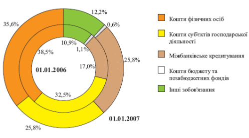 На рис. 1.5. зображена структура зобов’язань банківської системи України станом на 01.01.2006 року та 01.01.2007 року.
