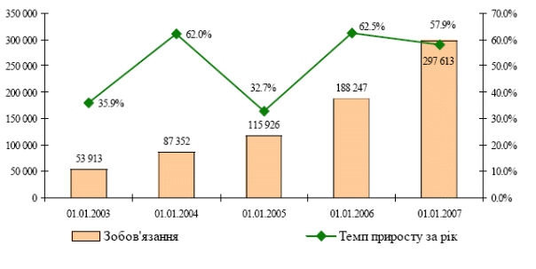 Протягом 2006 року продовжувалося зростання ресурсної бази українського банківського сектору, що супроводжувалося структурними змінами в зобов’язаннях банків. Проаналізуємо їх за 2006 рік. Зобов’язання банків в 2006 році зросли на 57,9% і станом на 01.01.2007 становили 298млрд. грн., з них зобов’язання перед нерезидентами – 23,7%. Основними ресурсами формування зобов’язань банків у 2006 році були: