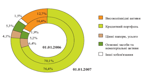 Загальні активи банківського сектору за аналізований період зросли з 105,5 млрд. грн. на 01.01.2004 року до 353,1 млрд. грн. на 01.01.2007 року. При цьому спостерігався ріст чистих активів відповідно з 100,2 млрд. грн. на 01.01.2004 року до 340,2 млрд. грн. на 01.01.2007 року. Важливим є ріст високоліквідних активів, що складав 179,6% за аналізований період. За аналізований період обсяг виданих кредитів зріс у 3,7 рази, при цьому найвищі темпи зростання кредитування спостерігалися у 2006 році і складали 72,5% за рік. Розглядаючи суб’єктів кредитування банківським сектором України слід відзначити превіліювання кредитування суб’єктів господарювання над кредитуванням фізичних осіб. У 2003 році питома вага виданих суб’єктам господарювання кредитів складала 79%, у 2004 році – 75%, у 2005 році – 70%, у 2006 році – 62%, поряд з цим кредитування фізичних осіб складало відповідно 12%, 15%, 21%, 29%, тобто спостерігалася тенденція зростання частки кредитування фізичних осіб і зменшення частки кредитування суб’єктів господарювання у загальному обсязі виданих українськими банками кредитів. Поряд з тенденцією зростання кредитування населення та суб’єктів господарювання спостерігалася тенденція зростання проблемних кредитів як у абсолютному виразі, так і у частці виданих кредитів, зокрема у 2003 році до проблемних кредитів віднесли кредити на суму 2,5 млрд. грн., у 2004 році – 3,15 млрд. грн., у 2005 році – 3,38 млрд. грн., у 2006 році – 4,46 млрд. грн.
