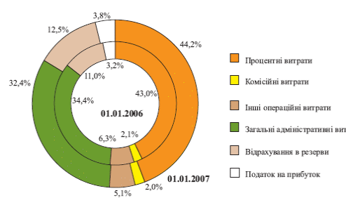 Витрати банків України за 2006 рік зросли на 48% і станом на 01.01.2007 року досягли 37,5 млрд. грн. Дане збільшення витрат відбулося за рахунок зростання процентних витрат – на 5,7 млрд. грн. (47,1% від суми збільшення витрат) і загальних адміністративних витрат – на 3,4 млрд. грн. (28,1%). У структурі витрат банків відбулися такі зміни: