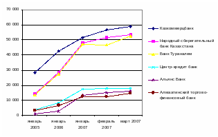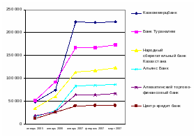Из рисунка 4 видно, что тройку лидеров по количеству активов возглавляет Казкомерцбанк, на втором месте Банк ТуранАлем. Необходимо отметить, что увеличение активов практически во всех банках отмечается до начала 2007 года. Далее у всех банков, кроме Банка ТуранАлем, прослеживается тенденция к снижению активов.