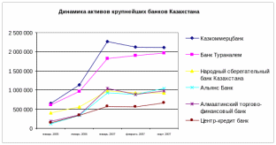 Выделив из таблицы 6 наиболее крупные банки, построена диаграмма (рисунок 3), которая наглядно отображает динамику роста активов крупнейших банков Казахстана.