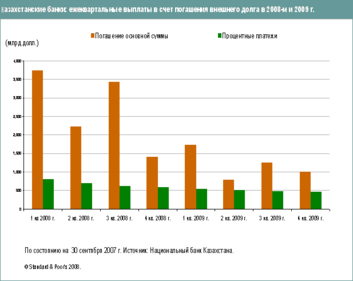 Согласно финансовым данным НБК на 30 сентября 2007 г., внешние обязательства казахстанских банков, подлежащие исполнению в 2008 г., составляли: по основной сумме – почти 11 млрд. долл., по процентам – почти 3 млрд. долл. (рисунок 6). В 2009 г. предстоит выплатить еще 5 млрд. долл. по основной сумме долга и 2 млрд. долл. по процентам – а может быть, и больше, если будут новые заимствования. Впрочем, более трети этих обязательств приходится на операции торгового финансирования, депозиты казахстанских юридических лиц, зарегистрированных в оффшорных зонах, секьюритизационные сделки, операции РЕПО, прямое финансирование зарубежных дочерних предприятий и транзитные платежи, по которым риски погашения и рефинансирования невелики.