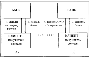 При помощи совершенно легальных операций прямой запрет на внебиржевую торговлю векселями «обходится» путем проведения двух взаимосвязанных, но юридически самостоятельных и потому безупречных операций. Одна из них - покупка у банка его векселя (позиция А на рис. 1) – регламентирована главой 3 Постановления № 25. Вторая – мена одного векселя (банка) на другой (ОАО «Белтрансгаз») (позиция Б на рис. 1) – регламентирована главой 16 этого же постановления Национального банка.