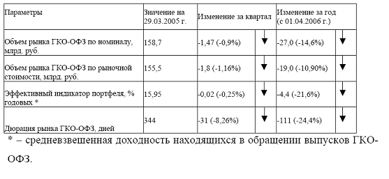 Ситуация на рынке государственных краткосрочных облигаций и облигаций федерального займа (ГКО-ОФЗ) в I квартале 2006 г. характеризовалась общей нестабильностью. Тенденция к снижению процентных ставок, преобладавшая на протяжении 2005 года, не получила продолжения. В целом по итогам квартала доходность ГКО-ОФЗ осталась практически неизменной – индикатор рыночного портфеля к началу апреля снизился лишь на 0,02% годовых до 15,95% годовых (таблица 1).