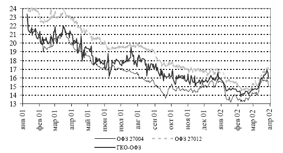 Наиболее значимыми негативными факторами, оказавшими определяющее влияние на ценовую динамику, стали – пониженный уровень банковской ликвидности и активизация эмиссионной политики Минфина РФ. В январе–марте общий уровень ликвидности банковской системы существенно снизился. Как следствие, оборот вторичного рынка ГКО-ОФЗ уменьшился в два раза, значительно возросла чувствительность рынка к колебаниям процентных ставок на рынке межбанковских кредитов (МБК), которые зачастую достигали 50% годовых.
