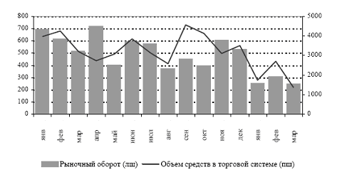 Активность вторичного рынка в январе–марте существенно снизилась. Суммарный объем торгов упал до 16 млрд. руб., что в 2 раза ниже показателя последнего квартала 2005 года. Средний ежедневный объем средств, зарезервированных в торговой системе ММВБ для участия в торгах, сократился на 46% до 1,94 млрд. рублей. Частичным объяснением этого может служить низкая деловая активность в начале года, связанная с большим количеством праздничных дней. Однако, объемные характеристики рынка в феврале и марте практически соответствовали показателям января
