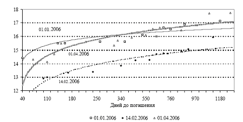 Рисунок 2 – Изменение кривой доходности ГКО-ОФЗ в I квартале 2006 г., % годовых (датами указаны проанализированные дни в течение квартала)