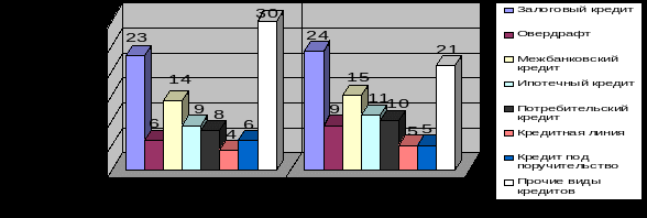 последнее время особый спрос в кредитной системе приобретают такие ссуды, как овердрафт, трастовый кредит, ипотека, онкольный кредит, клиринг, кредитные линии, потребительские кредиты и т.д. (рисунок 2.1). Достаточно большую долю на кредитном рынке (21% в 2005 г. в общем, объеме обращаемых кредитов) занимает предоставление таких традиционных видов кредитов, как кредит под банковскую гарантию, залоговый кредит, кредит под поручительство третьих лиц, межбанковские кредиты и т.д.