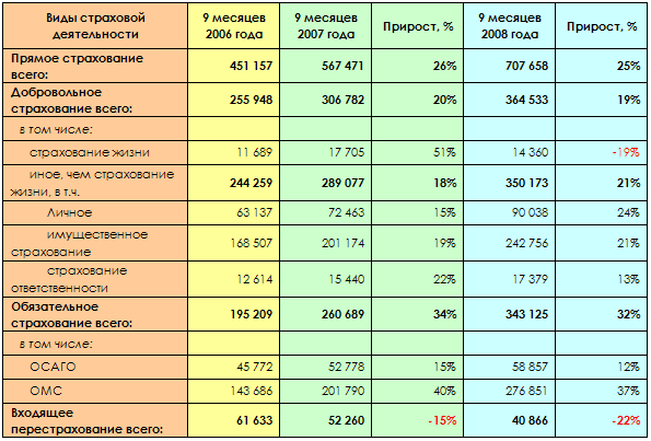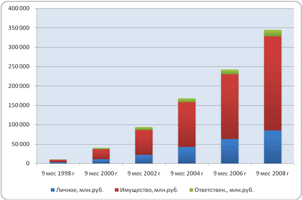 Таким образом, за первые 9 месяцев 2008 г. ключевыми факторами роста российского страхового рынка стало возрастающее потребление физических лиц, в первую очередь за счет заемных средств. Это вызвало увеличение страхования «кредитной жизни», автокаско физлиц, равно как и страхование других объектов залога (в первую очередь, ипотеки), а также рост сборов по ОСАГО. Помимо этого, наблюдался ренессанс псевдостраховых операций по корпоративному ДМС.