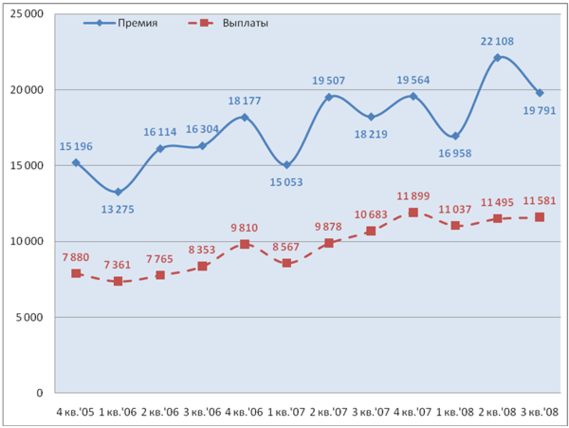 Поквартальная динамика премий и выплат компаний демонстрируют следующую тенденцию. Сборы премии достигают минимальных значений в первом квартале, значительно вырастают во втором и колеблются вокруг достигнутых значений до конца года. С течением времени, темпы роста сборов во втором квартале возрастают, одновременно с усиливающимся снижением в третьем квартале.