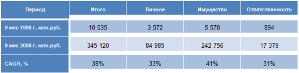 Таблица 2. Основные показатели российского страхового рынка за 9 мес. 1998 г. и 2008 г