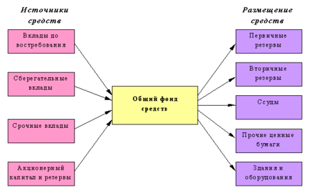 В основе метода общего фонда средств лежит идея объединения всех ресурсов. Затем совокупные средства распределяются между теми видами активов (ссуды, правительственные ценные бумаги, кассовая наличность и т.д.), которые считаются подходящими. В модели общего фонда средств для осуществления конкретной активной операции не имеет значения, из какого источника поступили средства, пока их размещение содействует достижению поставленных перед банком целей. Схематически этот метод представлен на рисунке 1.1
