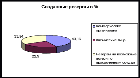 Исходя из таблицы 2 можно сделать вывод, что в целом созданных банков резервов для покрытия просроченных ссуд и кредитов хватит, т.к. резервы составляют 39388 тыс. руб., что на 9902 тыс. руб. больше всей суммы просроченных ссуд и кредитов. Если рассматривать детально, то увидим, что на просроченные ссуды и кредиты коммерческих организаций банк создал резерв в 3,6 раза превышающий размер данных ссуд и кредитов, а с физическими лицами, наоборот, в 2,8 раза меньше, т.е. банк ожидал просроченные ссуды и кредиты в большей степени со стороны коммерческих организаций. Также банк создал резервы на возможные потери по просроченным ссудам и кредитам резерв в размере 13368 тыс. руб., т.е. на случай вероятности банкротства предприятия или неспособности физических лиц погасить задолженность перед банком по ссудам и кредитам.