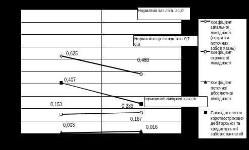 значення коефіцієнта строкової ліквідності значно нижче 0,7 – 0,8, тобто не задовольняє нормативним вимогам для рівня строкової ліквідності підприємства;