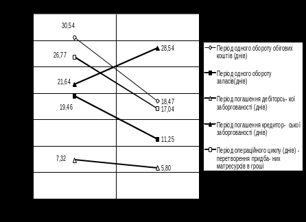 Як показано на графіках рис.2.6 за період з 2004 по 2005 рік період обороту характерних грошових агрегатів знизився в 1,5 – 2,1 рази, що свідчить про підвищення рівня ділової активності підприємства, але різко зріс період обороту кредиторської заборгованості, що є ризикованим для діяльності підприємства, оскільки рівень покриття кредиторської заборгованості дебіторською становить всього 30%.