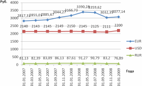 Если ранее при установлении обменного курса белорусского рубля к иностранным валютам фактически осуществлялась его привязка к доллару США, то в этом году в механизме курсообразования существенно усилилась роль других валют, наиболее значимых для экономики нашей страны показаны на рисунке 3. Со 2 января 2009 года Национальный банк перешел к использованию механизма привязки курса белорусского рубля к корзине иностранных валют: доллар США - евро - российский рубль.