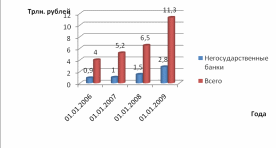 В уставные фонды банков с преобладающей долей государственной собственности государством внесены средства, которые увеличили банковский капитал в общей сложности на 3 трлн. рублей. В целом к концу 2008 года нормативный капитал банковского сектора страны достиг 11,3 трлн. рублей, увеличившись за год на 73,3 % в соответствии с рисунком 2