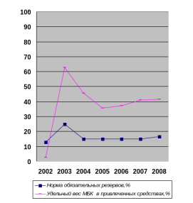 Значний вплив на збільшення обсягів міжбанківського кредитування зробило зміну Національним банком України (з 2003 по 2008р.) норми обов'язкових резервів, зокрема підвищення в 2008м (у порівнянні з 2007р.) з 15% до 16,5% від притягнутих засобів (Табл. 2.4.)