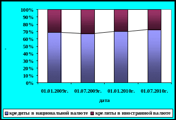 Из рисунка 3.3 видно, что динамика удельного веса кредитных вложений в разрезе валют неравномерна. Наименьшая доля кредитных вложений в национальной валюте наблюдается на 01.07.2010г. и составляет 67,4 процентных пункта, а наибольший удельный вес – на 01.07.2010г., что в относительном выражении составило 72,8 процентных пункта.