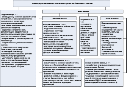 Т.е. мы видим, что на ход развития банковской системы, а, следовательно, и кредитной системы влияют экономические, политические и социальные факторы. На рис.2 представлены факторы, оказывающие влияние на развитие современных банковских систем. При этом ряд факторов являются экзогенными (или внешними) по отношению к ним, а ряд других эндогенными факторами, действующих в самих банковских системах (см. рис.2).