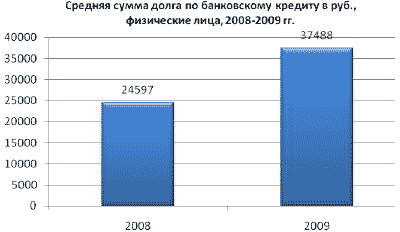 В течение 2008-2009 гг. растет средняя сумма долга заемщиков по кредиту. Средний темп прироста средней суммы долга составил 52,4%. Так, в 2008 году средняя сумма долга по кредиту физическому лицу составляла 24 597 рублей, в 2009 году - 37 488 рублей.