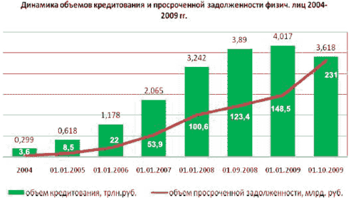 На 1 октября 2009 года объем просроченной задолженности по кредитам физическим лицам, по данным ЦБ РФ, составил 231 миллиард рублей. Это 6,38% от всех выданных на эту дату кредитов. Прирост доли просрочки по сравнению с началом года составил 2,68 процентных пункта, несмотря на имевшие место предложения кредиторов о рефинансировании кредитов в случае возникновения у заемщика трудностей с его погашением.