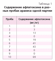 Показателен пример, продемонстрированный на Всемирном форуме по микотоксинам в Нидерландах. В табл. 1 представлены результаты анализа 10 проб пищевого арахиса по 5 кг каждая, отобранных из одной партии.