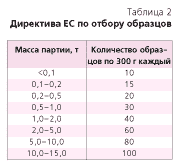 То есть, если специалист будет считать, что образец в 5 кг, отобранный из одного места, достаточно полно отражает качество партии продукта, анализ микотоксинов окажется простой тратой денег и времени. Один из наиболее совершенных и удачных методов отбора проб для анализа на содержание афлатоксина описан в Директиве ЕС (табл. 2).
