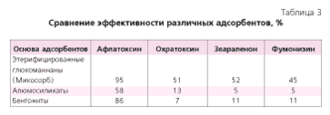 В табл. 3 приведены сравнительные данные эффективности нескольких адсорбентов, включая этерифицированные глюкоманнаны (Микосорб).5-8
