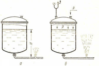 Рис. 5.1. Истечение жидкости при локальном повреждении аппарата: а - при атмосферном давлении в аппарате; б - при избыточном давлении в аппарате